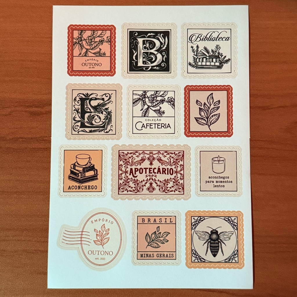 Uma cartela inteira com doze adesivos exclusivos da marca, perfeitos para você decorar diários e cadernos de leitura. 📖